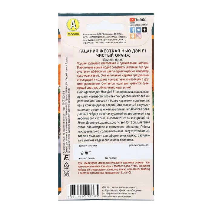 Семена Цветов Гацания "Нью Дэй", F1, чистый оранж, 5 шт — Характеристики