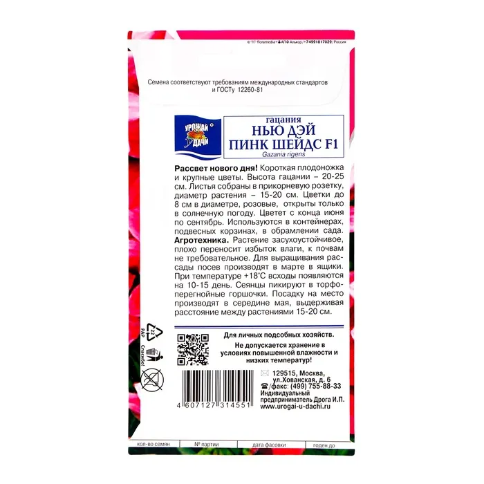 Семена цветов Гацания «Нью Дэй Пинк Шейдс», F1, для балкона, веранды, цветника, однолетник, низкорослая0.03 г — Характеристики