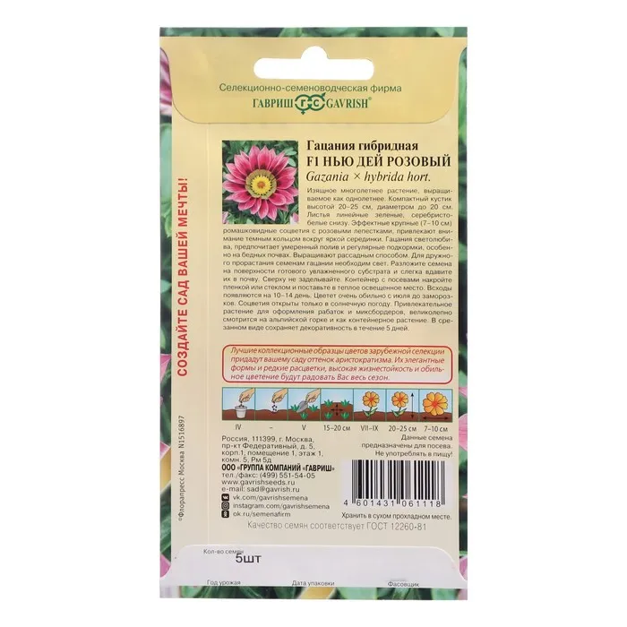 Изящное многолетнее растение, выращиваемое как однолетнее. Компактный кустик высотой 20-25 см, диаметром до 20 см. Листья линейные зеленые, серебристо-белые снизу. Эффектные крупные (7-10 см) ромашковидные соцветия с розовыми лепестками, привлекают внимание темным «кольцом» вокруг яркой серединки. Гацания светолюбива, предпочитает умеренный полив и регулярные подкормки, особенно на бедных почвах. Выращивают рассадным способом. Всходы появляются на 10-14 день. Цветет очень обильно с июля до заморозков. Соцветия открыты только в солнечную погоду. Привлекательное растение для оформления рабаток и миксбордеров, великолепно смотрится на альпийской горке и как контейнерное растение. В срезанном виде сохраняет декоративность в течение 5 дней.