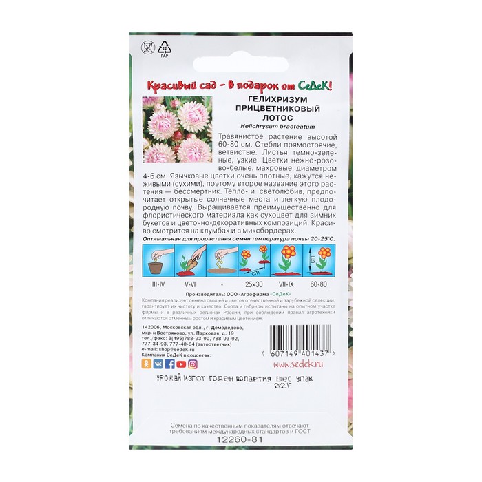 Семена цветов Гелихризум «Лотос», 0.2 г — Характеристики