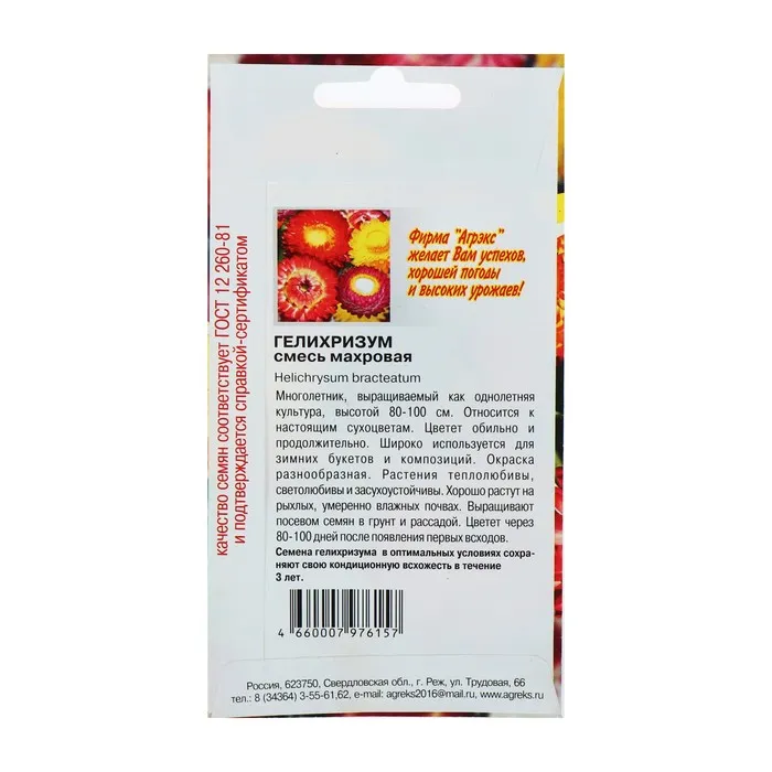 Лучший из бессмертников. На каждом растении образуется около 25 махровых соцветий диаметром 5-8 см. Высота 100 см. Используют для клумб, рабаток, на срезку. Великолепный сухоцвет, незаменим для зимних букетов.