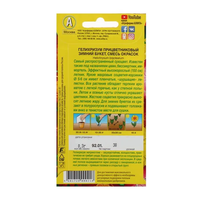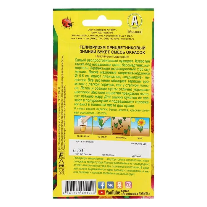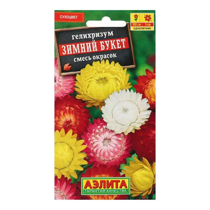 «Зимний букет» имеет яркие, махровые корзинки диаметром 5–6 см с жёсткими плёнчатыми лепестками. Гелихризум традиционно используется в сухих букетах.