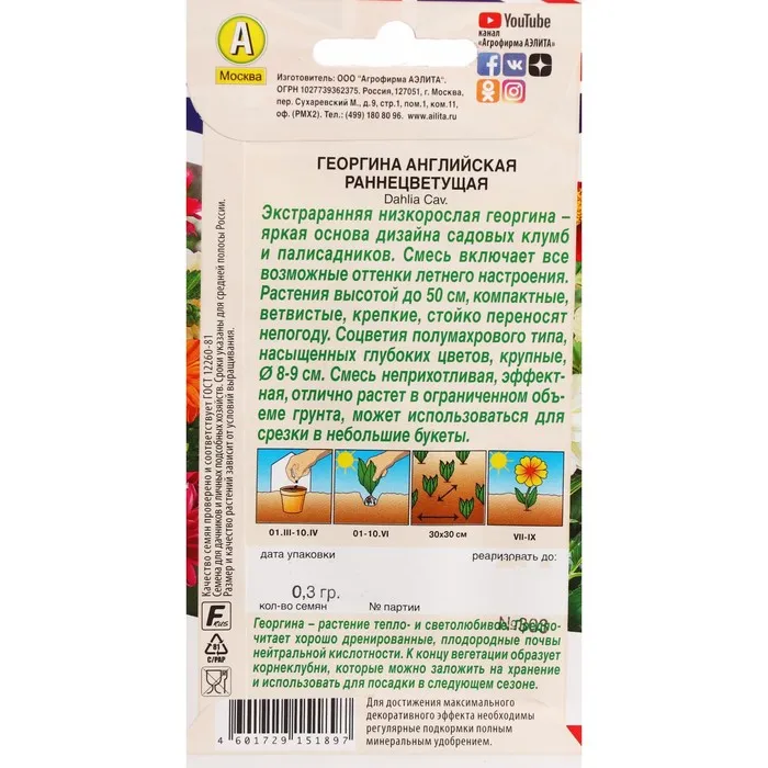 Экстраранняя низкорослая георгина – яркая основа дизайна садовых клумб и палисадников. Смесь включает все возможные оттенки летнего настроения. Растения высотой до 50 см, компактные, ветвистые, крепкие, стойко переносят непогоду. Соцветия полумахрового типа, насыщенных глубоких цветов, крупные, ? 8-9 см. Cмесь неприхотливая, эффектная, отлично растет в ограниченном объеме грунта, может использоваться для срезки в небольшие букеты.