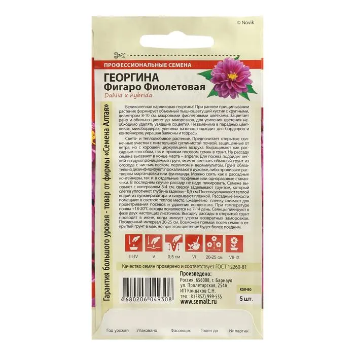 Великолепная карликовая георгина! При раннем прищипывании растение формирует объемный пышноцветущий кустик с крупными, диаметром 8-10 см, махровыми фиолетовыми цветками. Зацветает рано и обильно цветет до заморозков, для усиления цветения необходимо удалять увядшие соцветия. Незаменима в парадных цветниках, миксбордерах, уличных вазонах, подходит для бордюров и контейнеров, украшая балконы и террасы. Свето- и теплолюбивое растение. Предпочитает открытые солнечные участки с питательной суглинистой почвой, защищенные от ветра, но с хорошей циркуляцией воздуха. Выращивают как рассадным способом, так и прямым посевом семян в грунт. На рассаду семена высевают в конце марта - апреле. Для посева подойдет лёгкий воздухопроницаемый грунт, можно смешать обычный грунт из огорода с чистым песком, перлитом и вермикулитом. Грунт обязательно дезинфицируют: прокаливают в духовке, либо проливают раствором марганцовки или фунгицида. Можно сеять как в рассадные контейнеры, так и в отельные торфяные или одноразовые стаканчики. В последнем случае рассаду не надо пикировать. Семена высевают с интервалом 3-4 см, сверху заделывают грунтом, который слегка уплотняют, глубина заделки – 0,5 см. Посевы увлажняют теплой водой из пульверизатора и накрывают пленкой. Рассадные емкости помещают в светлое теплое место. Ежедневнопленку снимают для проветривания посевов и удаления конденсата. При температуре почвы +18-20°С всходы появляются на 7-14 день. Сеянцы пикируют в фазе двух настоящих листочков. Высадку рассады в открытый грунт проводят в июне, когда минует угроза возвратных заморозков. Посадочный интервал 25-30 см. Возможен прямой посев семян в открытый грунт в мае, но при этом цветение будет более поздним.