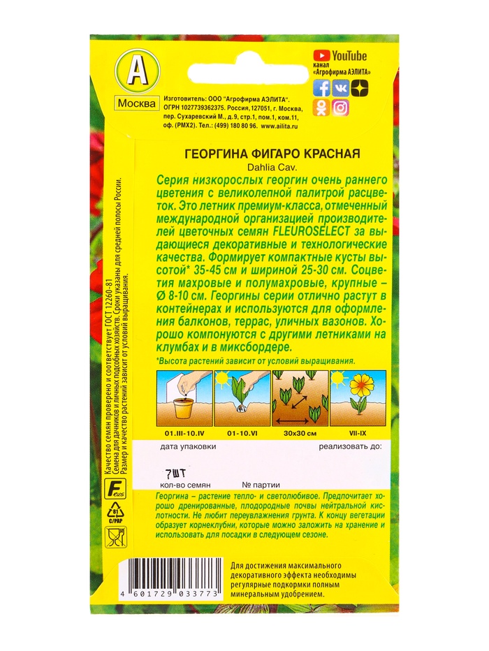 Семена цветов Георгина Фигаро махровая красная , Ц/П,7 шт. — Характеристики