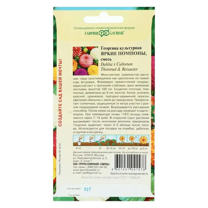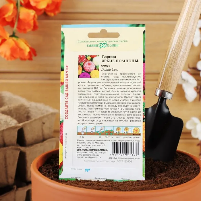 Многолетнее травянистое растение, чаще культивируемое как однолетник из семейства Астровые. Формирует прямостоячий полураскидистый куст с прочными стеблями, ярко-зелеными листьями, высотой 100 см. Соцветия плотные, помпонные, диаметром до 8 см, желтой, белой, розовой, красной, оранжевой, пурпурно-карминной окраски. Цветение обильное с июля до заморозков. Предпочитает солнечные, защищенные от ветра участки с рыхлой плодородной почвой. Выращивается рассадным способом. Посев семян на рассаду проводят в марте-апреле. В открытый грунт растения высаживают после окончания весенних заморозков. Георгина зацветает через 2-3 месяца после посева. Используется для посадки на клумбах, рабатках, в группах и на срезку.