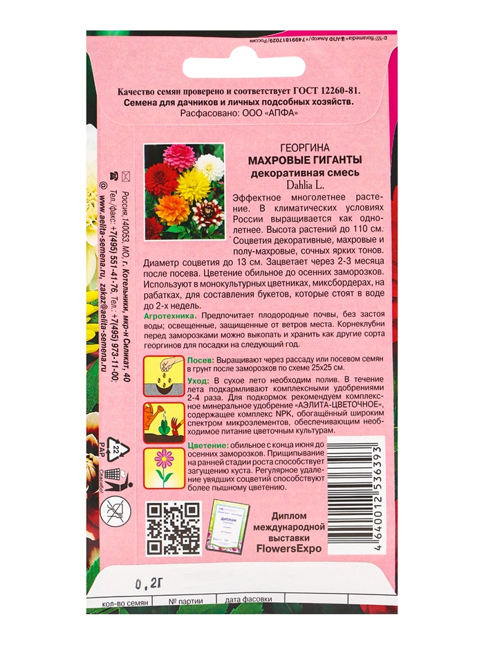 Семена цветов Георгина "Махровые гиганты", декоративная смесь, 0,2 г — Характеристики