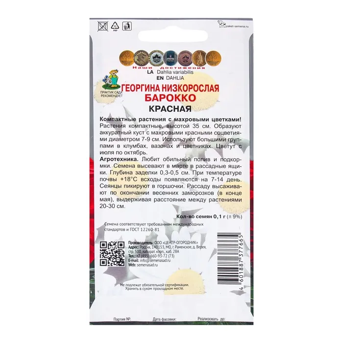 Семена цветов Георгина низкорослая "Барокко Красная", 0,1гр — Характеристики