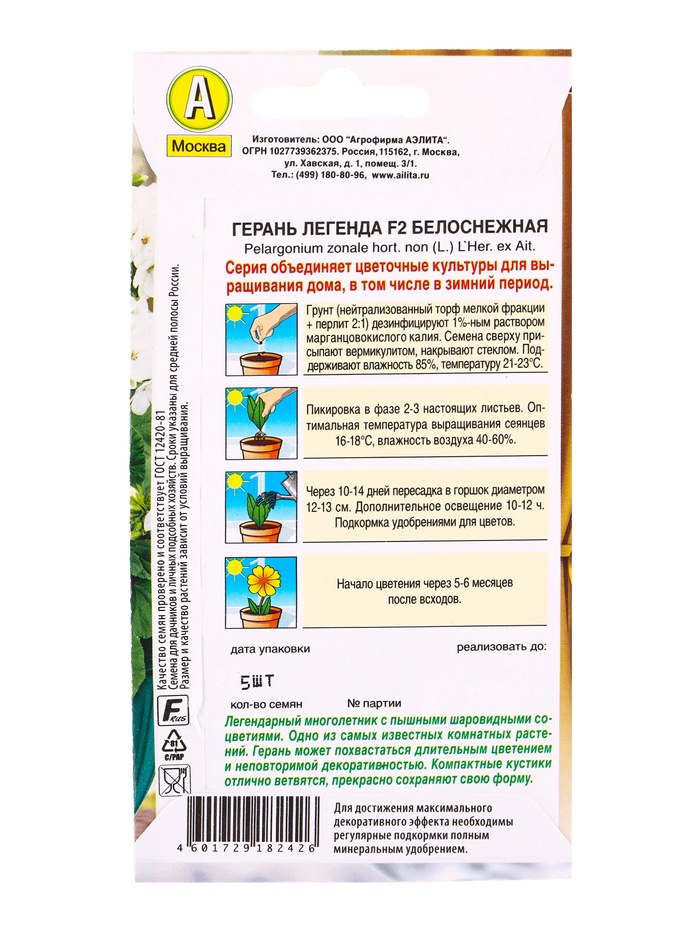 Семена цветов Герань Легенда F2 белоснежная Мн Зимний сад, Ц/П,5 шт. — Характеристики