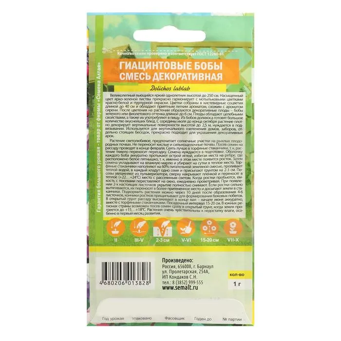 Великолепный вьющийся яркий однолетник высотой до 250 см. Насыщенный цвет ярко-зеленой листвы прекрасно гармонирует с мотыльковыми цветками красно-белой и пурпурной окраски. Цветки собраны в кистевидные соцветия длиной до 40 см и обладают приятным легким ароматом, схожим с ароматом сирени. После цветения на растении образуются декоративные плоды – бобы зеленого или фиолетового оттенка длиной до 6 см. Плоды обладают целебными свойствами, а также их употребляют в пищу. С середины июля до конца октября растение плотно декорирует вертикальные поверхности высотой до 2,5 м, нуждается в подвязывании. Используется для вертикального озеленения домов, заборов, отдельно стоящих беседок, прекрасно подходит для украшения декоративных арок. Растение светолюбивое, предпочитает солнечные участки на рыхлых плодородных почвах. Не переносит кислые и сильнощелочные почвы. Посев семян на рассаду проводят в конце февраля. Сеять лучше в торфяные стаканчики, т.к растение тяжело переносит пересадку. Семена нуждаются в подготовке. Оболочку каждого боба аккуратно протыкают острой иглой, избегая места на ребре, где расположено белое пятнышко, т.к. именно в этом месте появится росток. Затем семена укладывают на влажную марлю и убирают на сутки в теплое место. Торфяные стаканчики наполняют на 60% питательным субстратом, проливают теплой водой, в каждый кладут одно семя и присыпают грунтом на 2-3 см. Посевы увлажняют, сверху накрывают пленкой и переносят в теплое (+22…+24оС) место с рассеянным светом. Когда ростки пробьются, емкость с посевами переставляют на окно, ежедневно проветривая. При появлении 2-х настоящих листочков укрытие полностью снимают. Если ростки сильно вытягиваются, их переносят в более притененное место и досыпают земли в стаканчики. Подкормить растения можно через 10 дней после образования 4-6 листочков, кончики ростков прищипывают для формирования боковых побегов. В открытый грунт рассаду высаживают в конце мая - начале июня аккуратно, вместе с торфяными стаканчиками. Посадочный интервал 15-20 см. В южных регионах страны возможен посев семян сразу в открытый грунт, когда земля прогреется до +15…+18°С. Растения очень чувствительны к недостатку влаги, особенно в первый месяц развития.