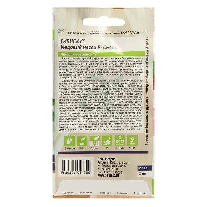 Великолепный сорт гибискуса поразит ваше воображение многочисленными огромными (диаметром 20 см) цветками. Растение образует вертикальные, хорошо ветвящиеся кусты высотой до 80 см и шириной 50-60 см. Цветки крупные бархатистые, белой, розовой и красно-бордовой окраски. В условиях средней полосы рекомендуется выращивать как горшечное растение, с содержанием в теплое время года на открытом воздухе. В южных регионах можно выращивать в открытом грунте как однолетник. Свето-, тепло-, влаголюбивое растение. Лучше растет на хорошо освещенных местах без попадания прямых солнечных лучей, однако, способен переносить и затенение. Для посева и пересадки используют готовый субстрат с высоким содержанием питательных веществ и нейтральной кислотностью. Посев на рассаду производят в феврале-марте. Семена необходимо подготовить, поместив во влажную ткань на 12 часов. Семена высевают на выровненный уплотненный грунт, присыпая сверху небольшим количеством субстрата, накрывают стеклом и помещают в теплое место с температурой +25°С. После появления 3-4 листочков сеянцы пикируют в отдельные горшочки с дренажем. Молодые растения следует пересаживать один раз в год, весной, а взрослые растения – по мере необходимости. Перые бутоны у молодых растений рекомендуется удалить. В весенне-летний период требуется проведение подкормок один раз в 10-15 дней водорастворимыми удобрениями для цветов и декоративных кустарников (чередовать минеральные и органические удобрения). В осенне-зимний период внесение удобрений прекращают или сокращают (в зависимости от состояния растения). Весной можно обрезать прошлогодний прирост гибискуса на 1/3 длины в целях омолаживания старых кустов и стимуляции цветения.