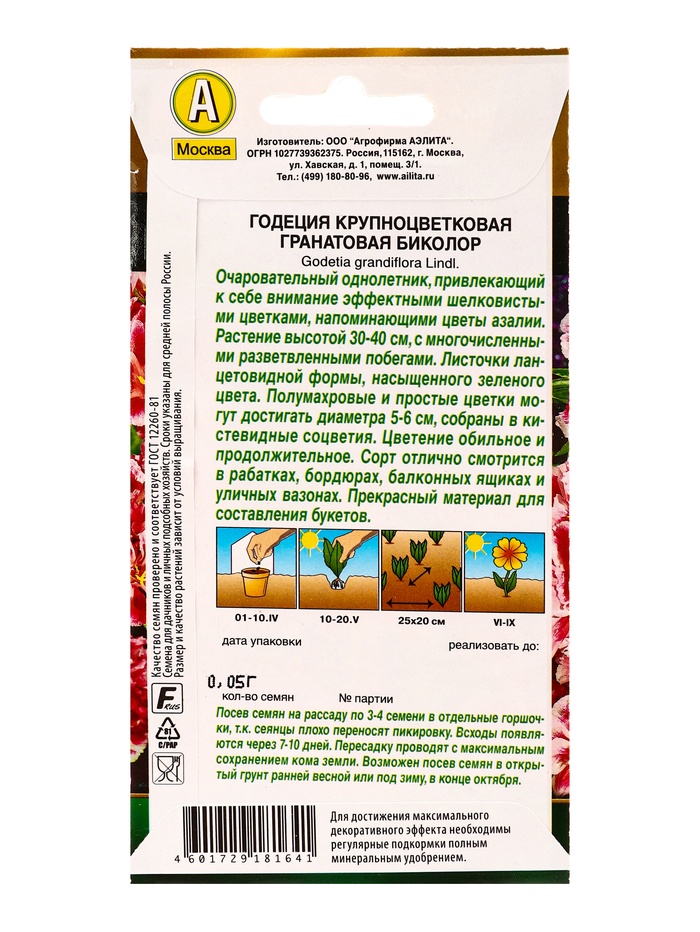 Семена цветов Годеция «Гранатовая Биколор», махровая, «Агрофирма АЭЛИТА», 0.05 г — Характеристики