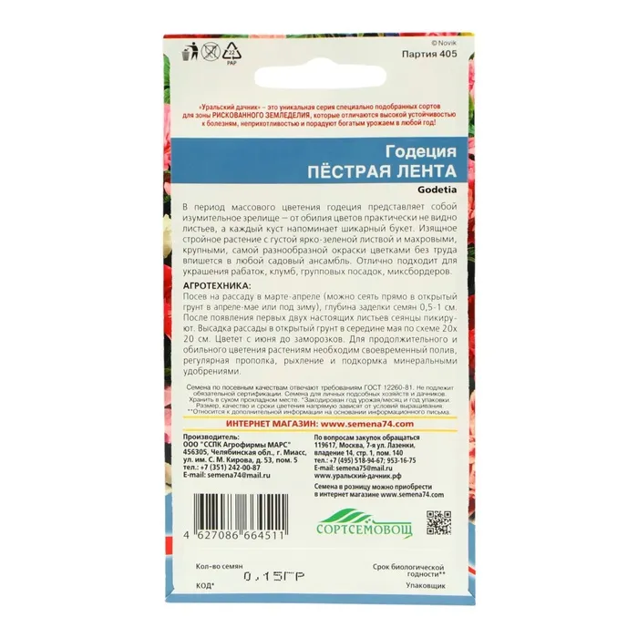 Семена Цветов Годеция "Пестрая лента" ,0 ,15 г , — Характеристики
