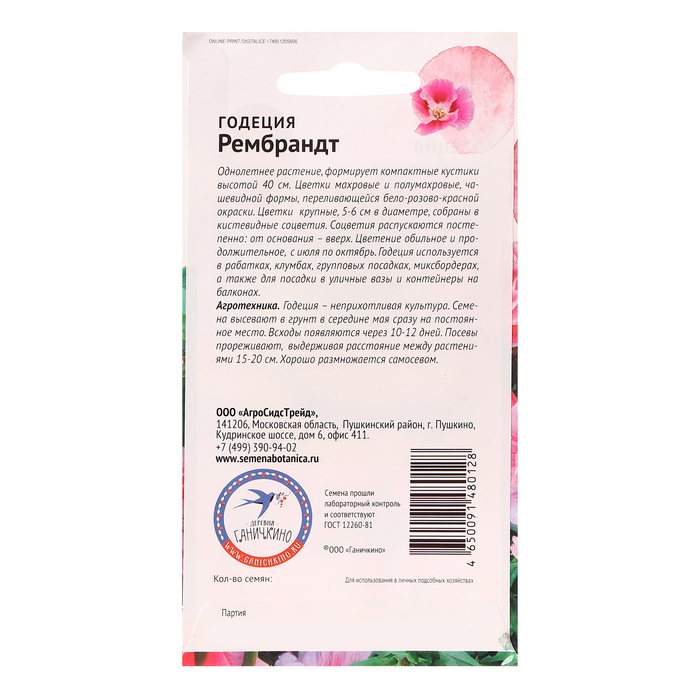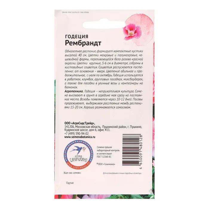 ГОДЕЦИЯ РЕМБРАНТ Однолетнее растение, формирует компактные кустики высотой 40 см. Цветки махровые и полумахровые, чашевидной формы, переливающейся бело-розово-красной окраски. Цветки крупные, 5-6 см в диаметре, собраны в кистевидные соцветия. Соцветия распускаются постепенно: от основания – вверх. Цветение обильное и продолжительное, с июля по октябрь. Годеция используется в рабатках, клумбах, групповых посадках, миксбордерах, а также для посадки в уличные вазы и контейнеры на балконах. Агротехника: Годеция – неприхотливая культура. Семена высевают в грунт в середине мая сразу на постоянное место. Всходы появляются через 10–12 дней. Посевы прореживают, выдерживая расстояние между растениями 15-20 см.Хорошо размножается самосевом. Штрих-код -4650091480128