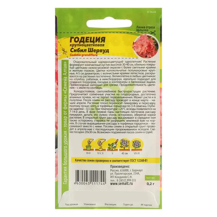 Очаровательный нарядноцветущий однолетник! Растение формирует компактный кустик высотой 30-40 см, обильно покрытый цветками нежно-розовой окраски с более светлыми краями и желтым глазком. Цветки колокольчатые полумахровые крупные, 4-5 см диаметром, с волнистыми краями лепестков, раскрываются на растении постепенно. Великолепна в любых цветниках: на клумбах, рабатках, в миксбордерах, идеально подходит для создания бордюров, посадки в контейнеры и балконные ящики. Превосходный материал для срезки. Продолжительность цветения – с июля по сентябрь. Холодостойкое, светолюбивое быстрорастущее растение. Предпочитает солнечные участки на плодородных, достаточно влажных нейтральных или слабокислых почвах, но не терпит переувлажнения. Может расти и в полутени. Посев семян на рассаду проводят в конце марта – начале апреля. Растение плохо переносит пикировку и пересадку, поэтому лучше сеять в торфяные горшочки по 3-4 семечка. Высевать семена можно поверхностно, но с целью минимизации риска пересыхания лучше присыпать их слоем грунта 0,3 см. В первые дни нужно обеспечить посевам парниковый эффект, увлажнять из пульверизатора. При температуре +20°C всходы появляются на 7-14-й день. При рассадном выращивании в фазе первой пары настоящих листочков рассаду пикируют, делать это нужно очень аккуратно, оберегая корни растения. В открытый грунт рассаду высаживают в середине мая, стараясь не разрушить земляной ком. В случае выращивания рассады в торфяных горшочках – высаживают вместе с ними. Посевы семян в открытый грунт проводят в апреле-мае с последующим прореживанием всходов. Схема посадки 20х30 см. Возможен подзимний посев семян в грунт сухим способом. Для обильного и продолжительного цветения рекомендуется пару раз в месяц подкармливать комплексными удобрениями с невысоким содержанием азотных компонентов. После поливов допускается производить неглубокое рыхление почвы, что улучшает воздухопроницаемость грунта.