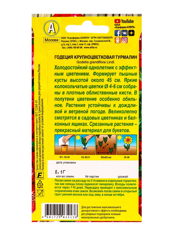 Семена цветов Годеция Турмалин , Ц/П,0,1 г — Характеристики