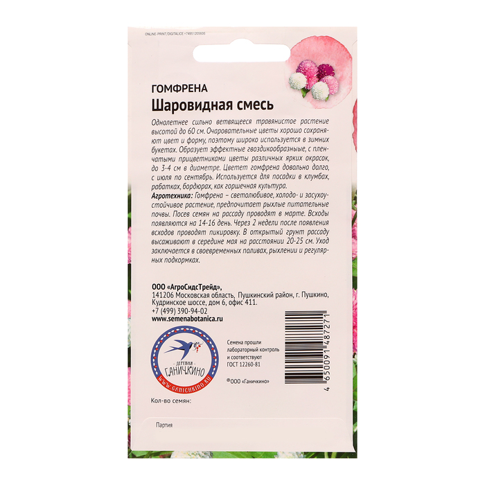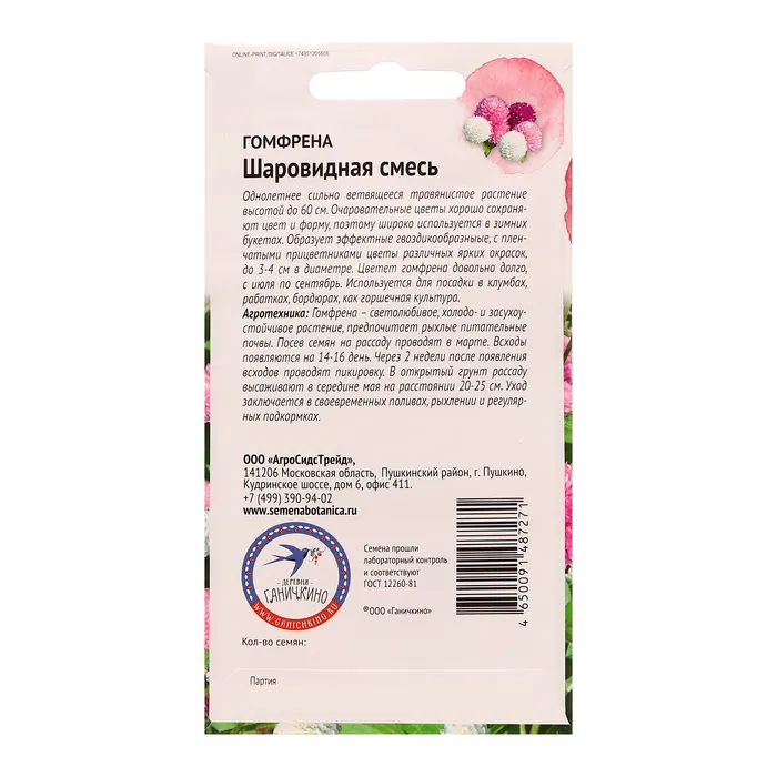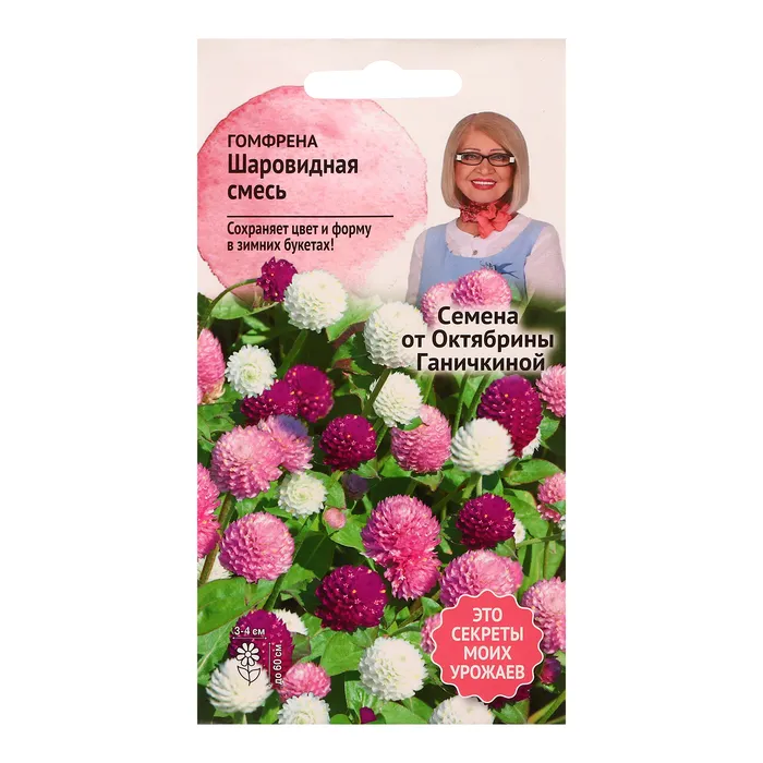Однолетнее сильно ветвящееся травянистое растение высотой до 60 см. Очаровательные цветы хорошо сохраняют цвет и форму, поэтому широко используется в зимних букетах. Образует эффектные гвоздикообразныые, с пленчатыми прицветниками цветы различных ярких окрасок, до 3-4 см в диаметре. Цветет гомфрена довольно долго, с июля по сентябрь. Используется для посадки в клумбах, рабатках, бордюрах, как горшечная культура. Агротехника: Гомфрена – светолюбивое, холодо- и засухоустойчивое растение, предпочитает рыхлые питательные почвы. Посев семян на рассаду проводят в марте. Всходы появляются на 14-16 день. Через 2 недели после появления всходов проводят пикировку. В открытый грунт рассаду высаживают в середине мая на расстоянии 20-25 см. Уход заключается в своевременных поливах, рыхлении и регулярных подкормках. Штрих-код -