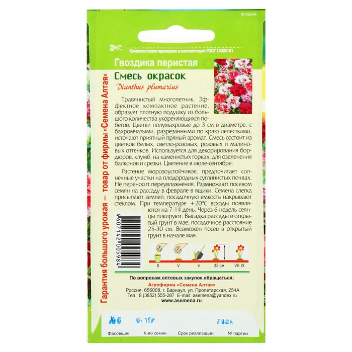 Травянистый многолетник. Эффектное компактное растение, образует плотную подушку из большого количества укореняющихся побегов. Цветки полумахровые до 3 см в диаметре, с бахромчатыми, разрезанными по краю лепестками, источают приятный пряный аромат. Смесь состоит из цветков белых, светло-розовых, розовых и малиновых оттенков. Используется для декорирования бордюров, клумб, на каменистых горках, для озеленения балконов и срезки. Цветение в июле-сентябре. Растение морозоустойчивое, предпочитает солнечные участки на плодородных суглинистых почвах. Не переносит переувлажнения. Хорошо реагирует на подкормки минеральными удобрениями.