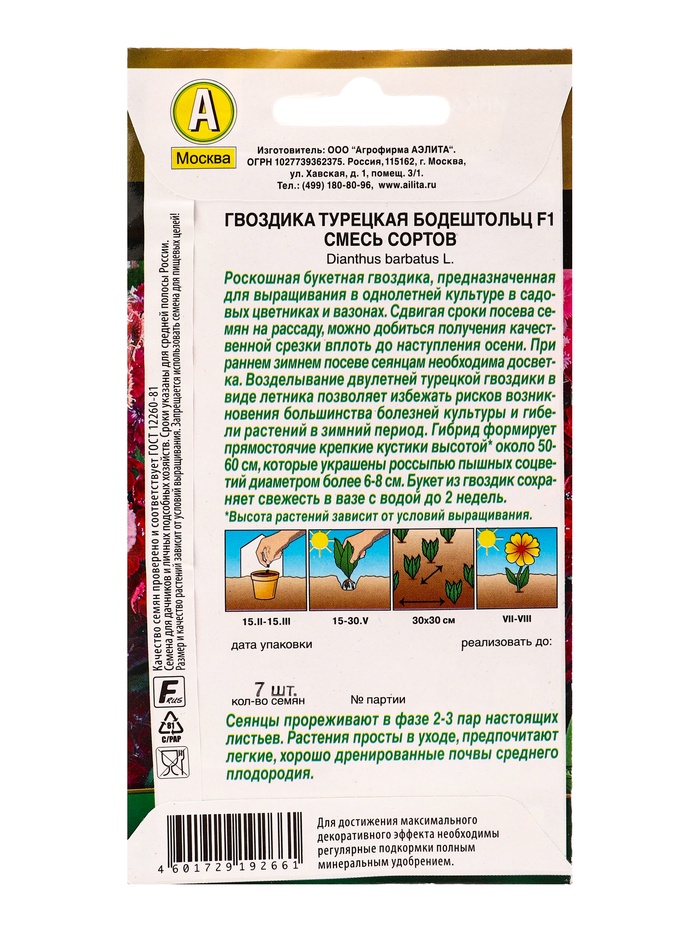 Семена цветов Гвоздика турецкая Бодештольц F1, смесь сортов Золотая серия, Ц/П,7 шт. — Характеристики