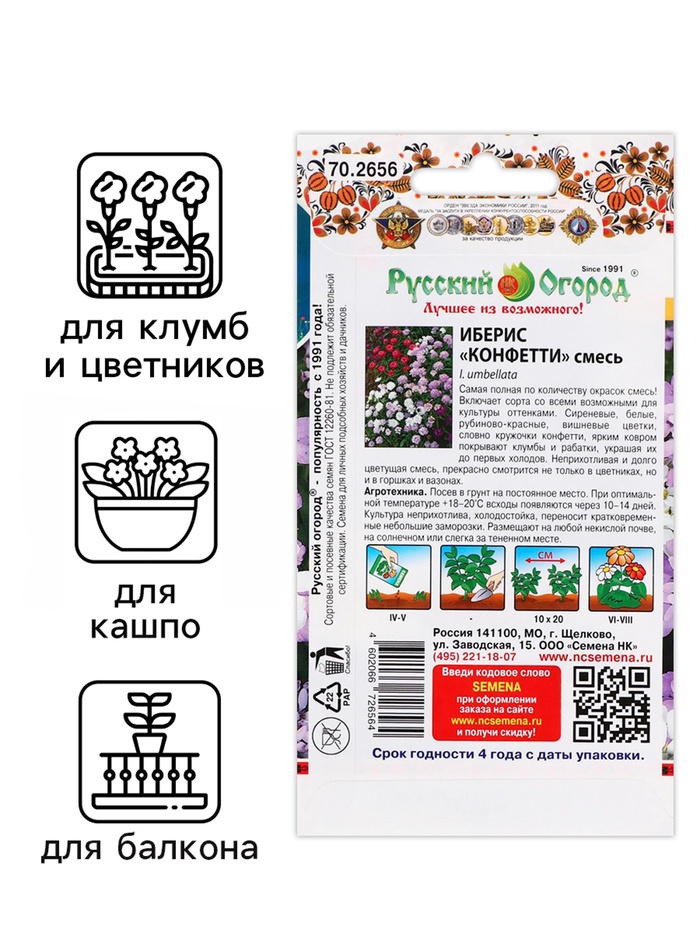 Иберис Конфетти – самая полная смесь, состоящая из разных цветовых сочетаний. Белые, розовые, лиловые и пурпурные соцветия, источающие сладостны аромат, хорошо будут смотреться как в цветниках, так и на альпийских горках или вазонах. Иберис создан, именно для тех, кому не хочется много ухаживать за цветами, зато хочется как можно дольше любоваться разноцветным ландшафтным дизайном садовых клумб. Высота ибериса не превышает 35 см, а значит это будет отличная база, как для нового цветника, так и для того, чтобы вдохнуть новую жизнь в старый. Хочется также отметить, что растение очень редко болеет и очень быстро разрастается. Если в ваши планы не входит увеличение площади ибериса – посадите его в заранее заготовленный горшок, который не позволит корням разрастаться.