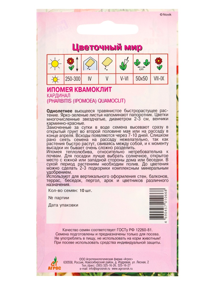 Семена цветов Ипомея квамоклит «Кардинал», 10 шт., «Агрос» — Характеристики