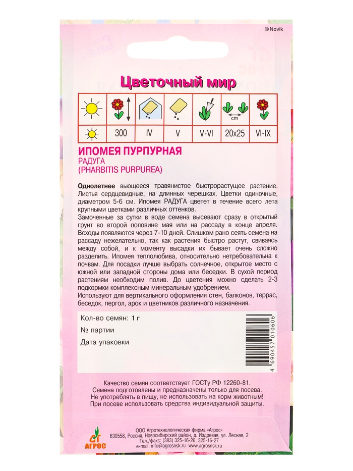 Семена цветов Ипомея пурпурная «Радуга», 1 г, «Агросс» — Характеристики