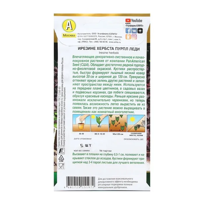 Впечатляющее декоративно-лиственное и почвопокровное растение от компании PanAmerican Seed (США). Обладает достаточно редкой пурпурно-фиолетовой окраской. Кустики распростертые, быстро формируют пышный низкий ковер высотой 20 см и шириной до 120 см. Прекрасно оттеняют яркую зелень других растений и заполняют пространства между ними. Используются на переднем плане цветников, в садовых вазах и подвесных корзинах, где побеги свешиваются, образуя красивые каскады. Раньше ирезине размножали исключительно черенками, но теперь появилась возможность легко вырастить ее из семян. Также это растение можно выращивать в помещениях как комнатный многолетник.