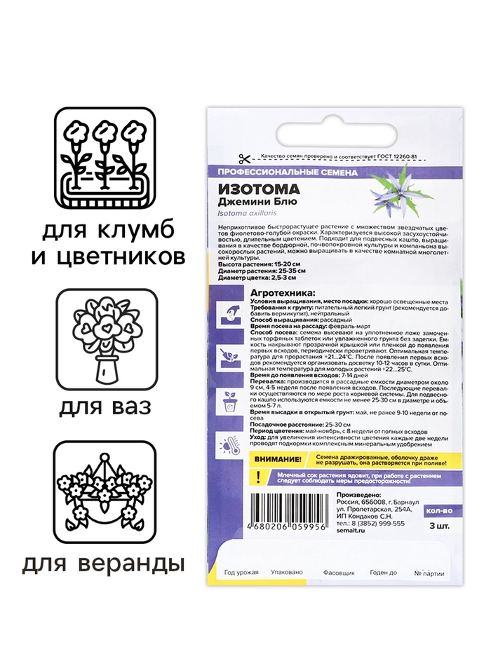 Семена цветов Изотома Джемини Блю, ц/п, 3 шт. — Характеристики