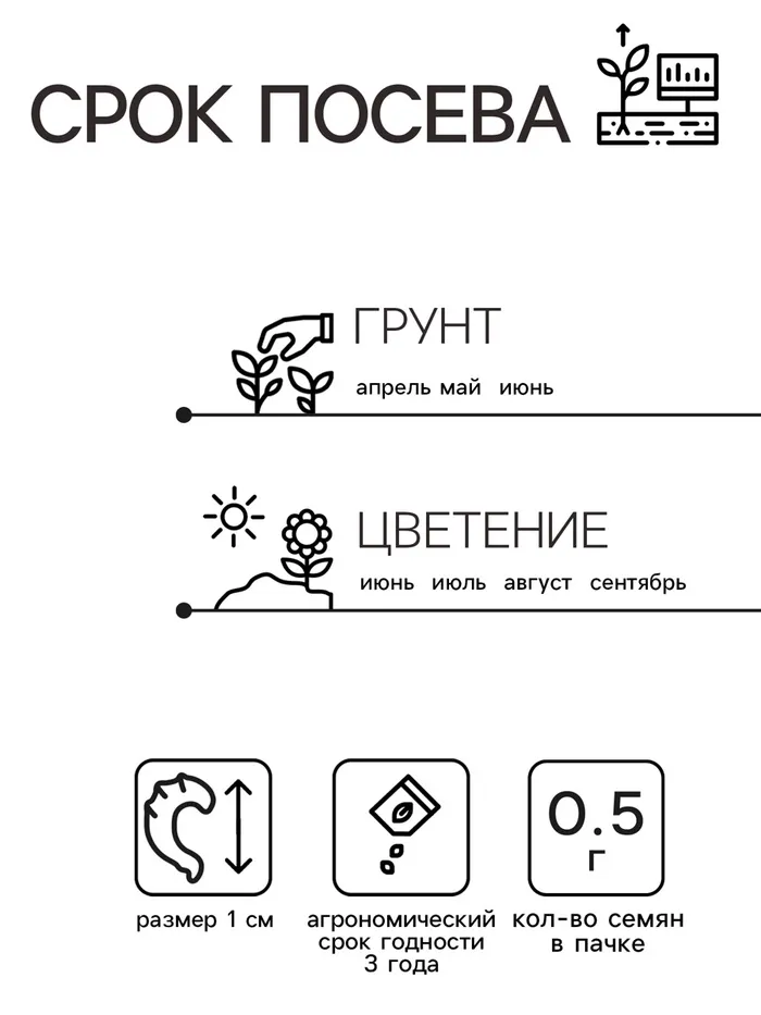 Как сажать. Семена сеют в открытый грунт в мае, рядками с расстоянием между ними 20 см. Затем всходы прореживают, оставляя расстояние 20 см между растениями. Цветение наступает в июле. Для более раннего цветения (в июне) возможен посев на рассаду в апреле или подзимний посев (в конце октября).