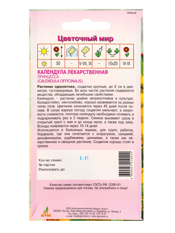 Семена цветов Календула «Принцесса», 0.5 г, «Агрос» — Характеристики