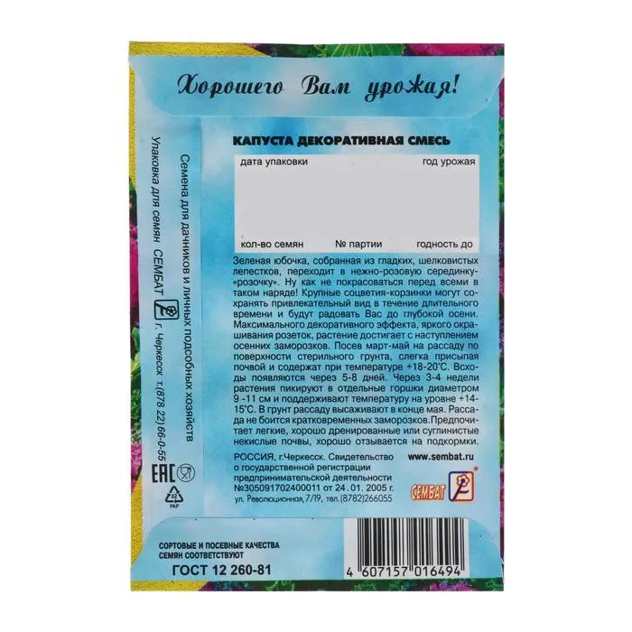 Однолетнее растение до 30 см высотой. Оригинальное по форме и окраске травянистое растение. Розетка листьев шаровидно – плоской формы, рыхлая. Листья небольшие, изящные, сильно гофрированные по краю. Окраска наружных листьев розетки зеленая, а внутренние имеют разнообразную окраску: от белой до пурпурной. С установлением прохладной погоды растения приобретают наиболее декоративную, яркую окраску. Используется для оформления бордюров, миксбордера, садовых вазонов и создания оригинальных и эффектных композиций.