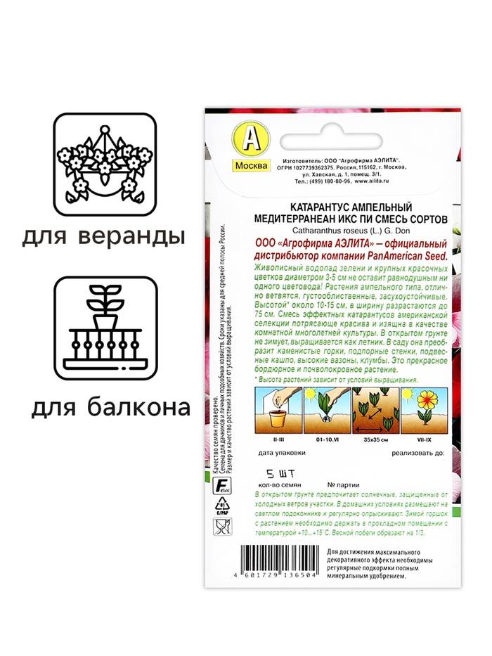 Семена цветов Катарантус ампельный "Медитерранеан Икс Пи" смесь сортов, ц/п, 5 шт — Характеристики