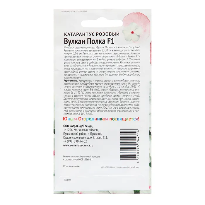 Новейшая сериякатарантуса«ВулканF1» чешской компании Cerny Seed. Растения компактные, ветвистые, 25–30 см в высоту, с цветками диаметром 5,5–6 см. Лепестки цветков взаимно перекрываются. Большим преимуществом является раннее зацветание. Гибриды «Вулкан 1» зацветают одновременно, на 2 недели раньше на две недели раньше гибридов. F Учитывая факт, что речь идет о гибридах первого поколения. Растения отличаются устойчивостью к болезням, легче переносят стрессовые ситуации, такие как, жару, засуху и повышенную влажность, прекрасно сохраняют превосходный размер цветка и интенсивность цветочного оттенка. Катарантус – незаменимая культура для создания бордюров, рабаток, вазонов и кашпо. Агротехника: Катарантус – тепло-, свето- и влаголюбивая культура, предпочитает плодородные хорошо окультуренные почвы. На рассаду семена высевают в феврале-марте на глубину 1-1,5см. При 24-25°С всходы появятся через 3-6 дней, пленку убирают, температуру снижают до 21-22°С, слегка понижают влажность субстрата и ставят сеянцы в светлое место, избегая попадания прямых солнечных лучей. Далее частоту поливов сокращают, допуская легкое подсыхание поверхности почвы. Дополнительное освещение обеспечит более насыщенную окраску листьев. На постоянное место рассаду высаживают в мае, когда минует угроза заморозков, по схеме 20х25 см или в отдельные горшки. Уход заключается в регулярных обильных поливах опрыскиваниях и подкормках каждые 10-14 дней. Штрих-код -
