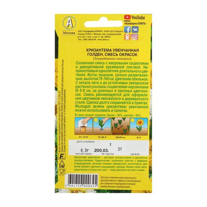 Семена цветов Хризантема "Голден увенчанная", смесь окрасок, О, 0,3 г — Характеристики