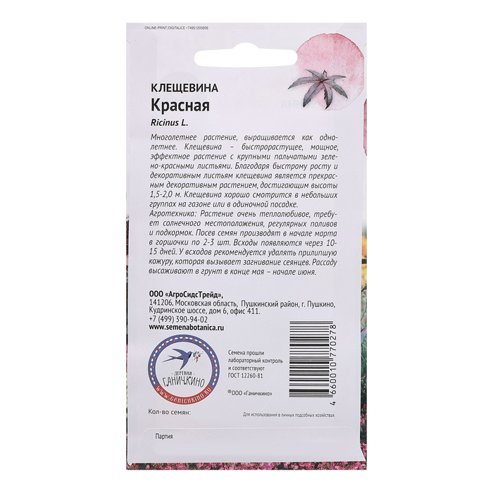 Многолетнее растение, выращивается как однолетнее. Клещевина – быстрорастущее, мощное, эффектное растение с крупными пальчатыми зелено-красными листьями. Благодаря быстрому росту и декоративным листьям клещевина является прекрасным декоративным растением, достигающим высоты 1,5-2,0 м. Клещевина хорошо смотрится в небольших группах на газоне или в одиночной посадке. Агротехника: Растение очень теплолюбивое, требует солнечного местоположения, регулярных поливов и подкормок. Посев семян производят в начале марта в горшочки по 2-3 шт. Всходы появляются через 10-15 дней. У всходов рекомендуется удалять прилипшую кожуру, которая вызывает загнивание сеянцев. Рассаду высаживают в грунт в конце мая – начале июня. Штрих-код - 4660010770278