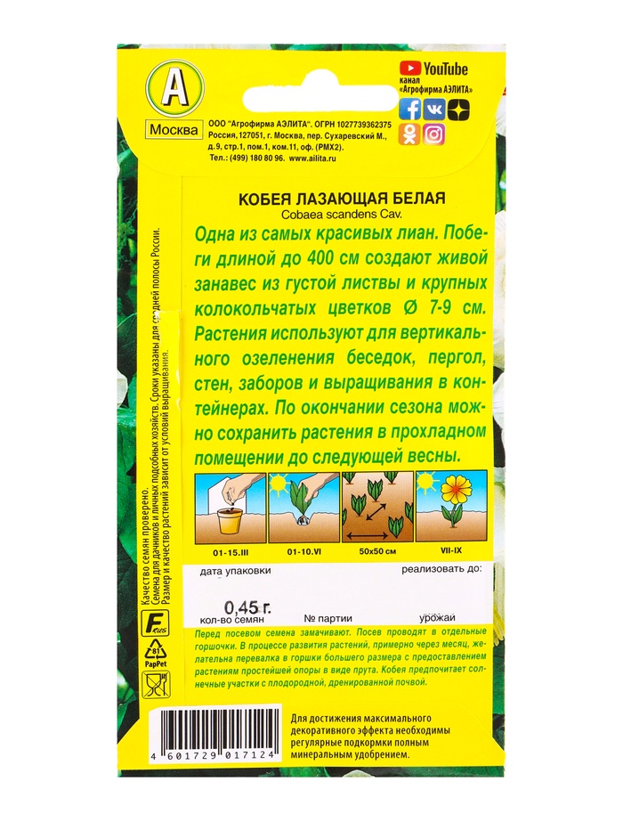 Семена цветов Кобея белая , Ц/П,0,45 г — Характеристики