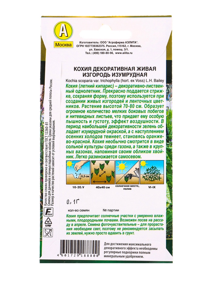 Семена цветов Кохия Живая изгородь изумрудная Золотая серия, Ц/П,0,1 г — Характеристики