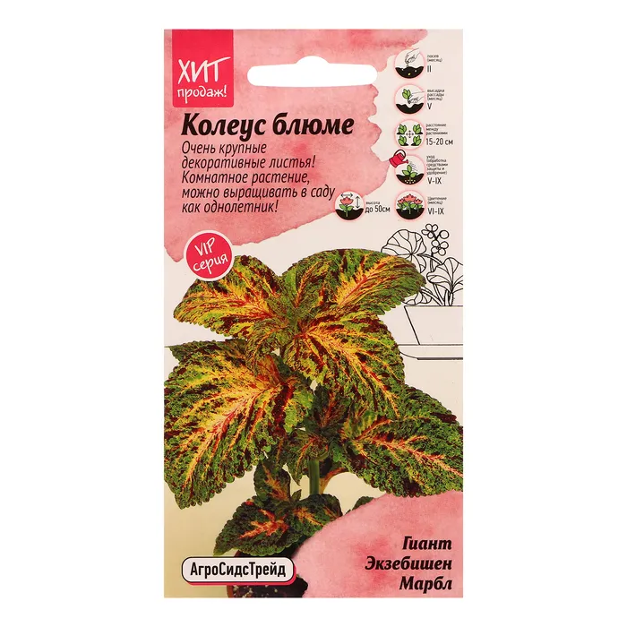 Комнатное растение с декоративной листвой, которое можно выращивать в Саду как однолетник! Великолепная серия от японской компании Takii Seed с очень крупными декоративными листьями. Отличается хорошим ветвлением куста. Высота растения 50 см. Цветки мелкие, невзрачные, собраны в колосовидное соцветие. Для поддержания привлекательного вида необходимо удалять соцветия. Сочетания окрасок поражают воображение. При касании поверхности листьев руками ощущается их бархатистость. Исключительно легкое в уходе, но при этом очень красивое растение с яркими листьями и сочными стеблями для дома и сада. В грунте не зимует, поэтому осенью необходимо пересадить в горшок и убрать в помещение. Колеус – незаменимая культура для создания бордюров, рабаток, вазонов и кашпо. Можно выращивать как комнатное растение. Агротехника: Колеус (крапивка) – тепло-, свето- и влаголюбивая культура, предпочитает плодородные хорошо окультуренные почвы. На рассаду семена высевают в феврале-марте. Для прорастания семян необходимо достаточное освещение и температура 21-25˚С. Всходы появляются через 10-14 дней. В фазе 2-го настоящего листа сеянцы пикируют. Для формирования невысокого пышного кустика необходимо проводить прищипывание. Дополнительное освещение обеспечит более насыщенную окраску листьев. На постоянное место рассаду высаживают в мае, когда минует угроза заморозков, по схеме 15х20 см или в отдельные горшки. Уход заключается в регулярных обильных поливах и опрыскиваниях, подкормках каждые 10-14 дней и формирующих обрезках. Штрих-код -