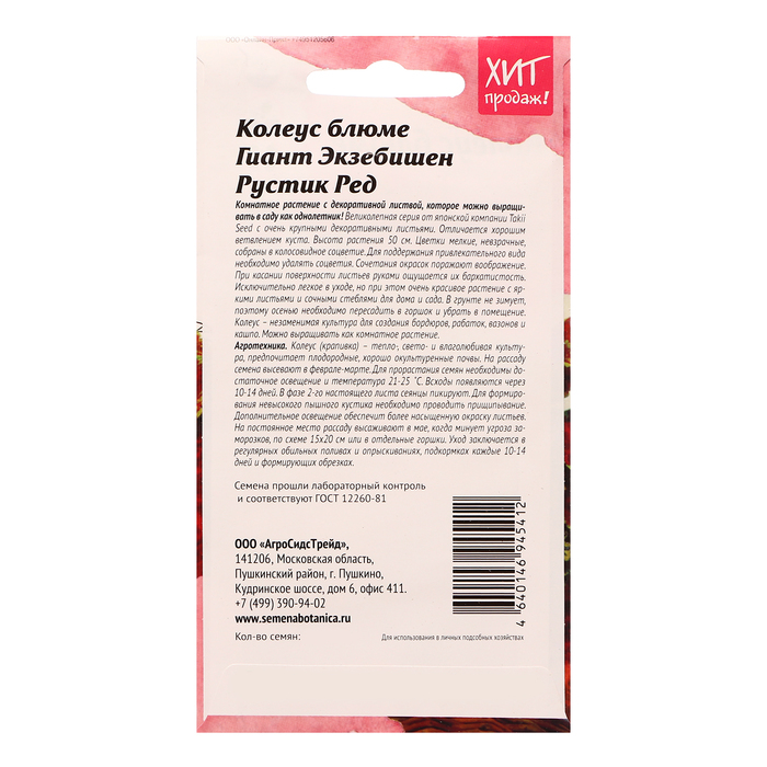 Семена Цветов Колеус блюме «Гиант Экзибишен Рустик Ред», 10 шт., «Агросидстрейд» — Характеристики