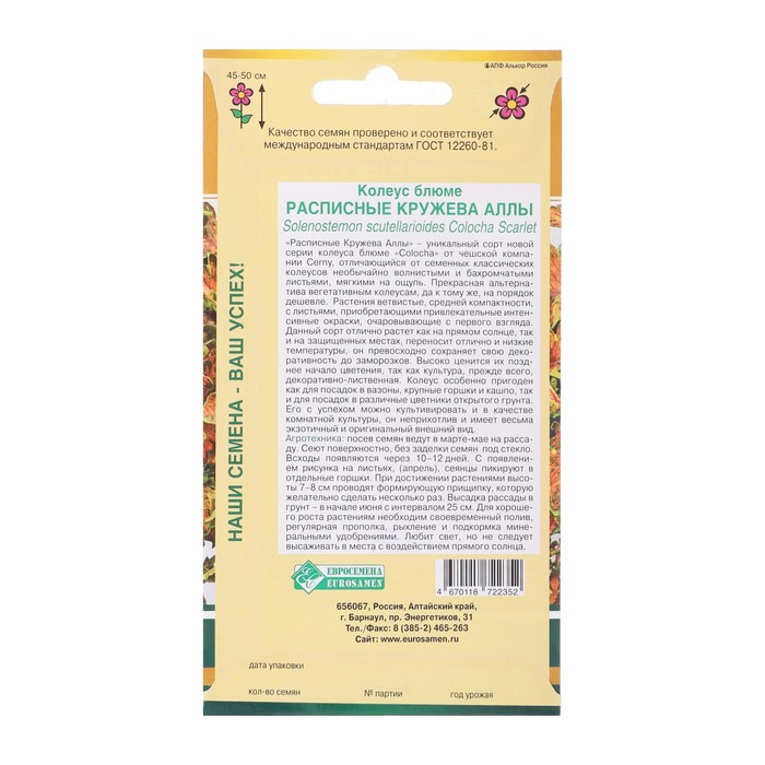 Семена цветов Колеус блюме «Кружева Аллы», 10 шт., «Евросемена» — Характеристики