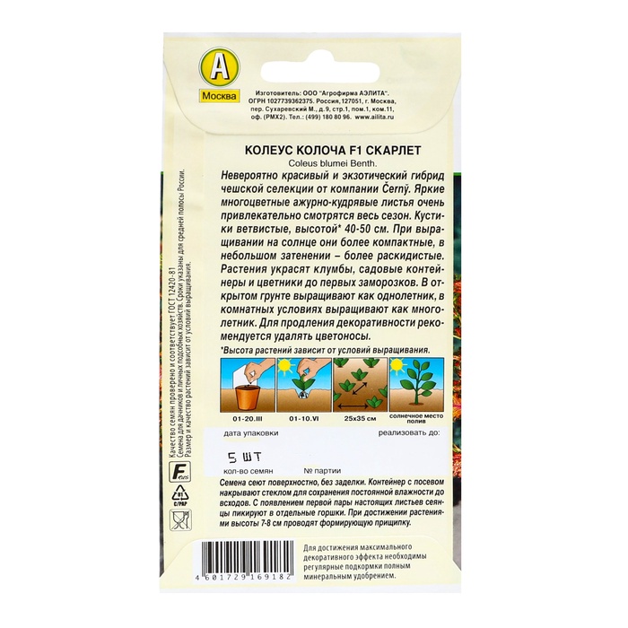 Семена цветов Колеус "Колоча" F1 скарлет, ц/п, 5 шт — Характеристики