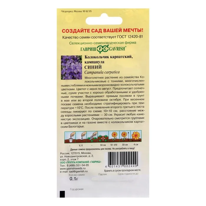 Семена цветов Колокольчик карпатский «Синий», многолетник, для альпийской горки, ц/п, 0.05 г — Характеристики