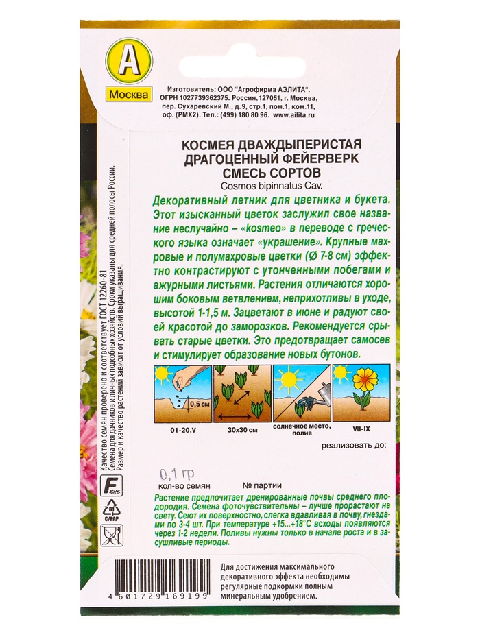 Семена цветов Космея Драгоценный фейерверк, смесь сортов Золотая серия, Ц/П,0,1 г — Характеристики