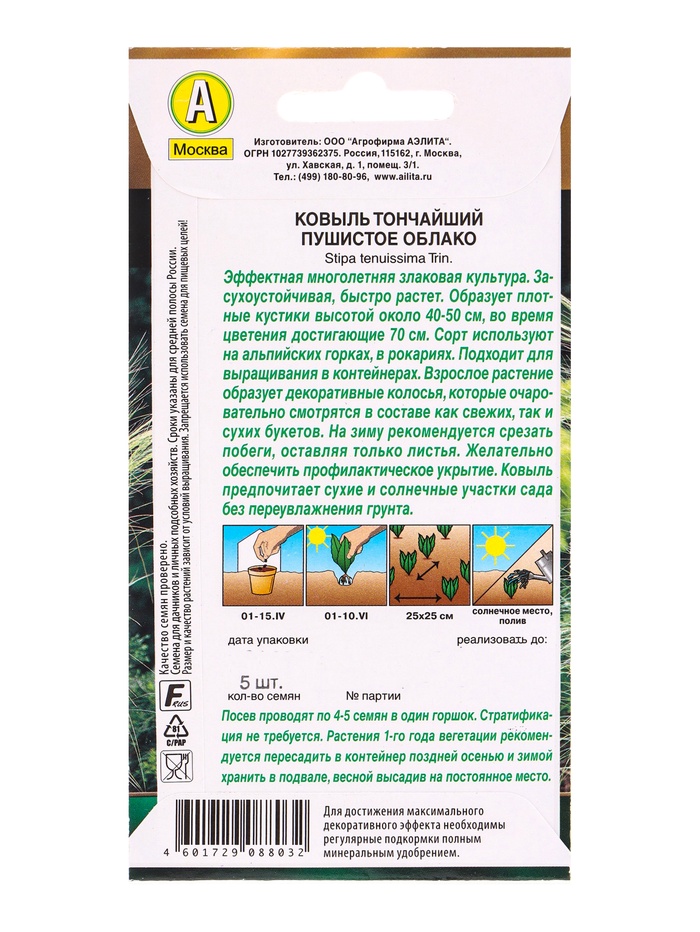 Семена цветов Ковыль Пушистое облако Мн Золотая серия, Ц/П,5 шт. — Характеристики