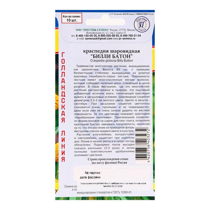 Семена цветов Краспедия шаровидная "Билли Батон", 10 шт — Характеристики
