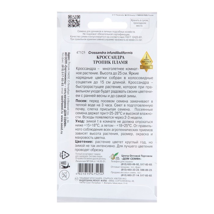 Семена цветов Кроссандра "Тропик" пламя, 3 шт — Характеристики