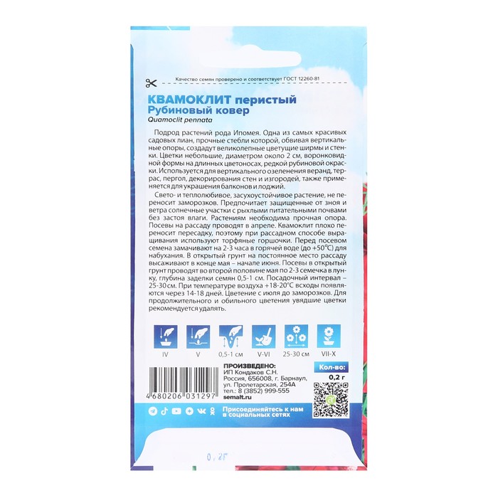 Подрод растений рода Ипомея. Одна из самых красивых садовых лиан, прочные стебли которой, обвивая вертикальные опоры, создадут великолепные цветущие ширмы и стенки. Цветки небольшие, диаметром около 2 см, воронковидной формы на длинных цветоносах, редкой рубиновой окраски. Цветет с июля до осенних заморозков. Используется для вертикального озеленения веранд, террас, пергол, декорирования стен и изгородей, также применяется для украшения балконов и лоджий. Свето- и теплолюбивое, засухоустойчивое растение, не переносит заморозков. Предпочитает защищенные от зноя и ветра солнечные участки с рыхлыми питательными почвами без застоя влаги. Растениям необходима прочная опора. Посевы на рассаду проводят в апреле. Ипомея плохо переносит пересадку, поэтому при рассадном способе выращивания используют торфяные горшочки. Перед посевом семена замачивают на 2-3 часа в горячей воде (до +50С) для набухания. В открытый грунт на постоянное место рассаду высаживают в конце мая - начале июня. Посевы в открытый грунт проводят во второй половине мая по 2-3 семечка в лунку, глубина заделки семян 0,5-1 см. Посадочный интервал – 25-30 см. При температуре воздуха +18-20°С всходы появляются через 14-18 дней. Для продолжительного и обильного цветения увядшие цветки рекомендуется удалять.
