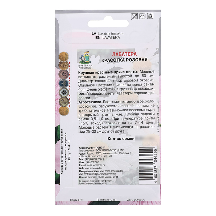 Крупные красивые яркие цветы. Мощные ветвистые растения высотой до 60 см. Обильное цветение с июля до конца сентября. Очень эффектны в групповых посадках, миксбордерах, цветы лаватеры хороши для срезки.Агротехника. Растение светолюбивое, холодостойкое, засухоустойчивое. К почвам не требовательное. Размножают посевом семян в открытый грунт в мае. Глубина заделки семян 0,5-1,0 см. При температуре почвы +15°C всходы появляются на 7-14 день. Молодые растения высаживают на расстоянии 25-30 см друг от друга. Семена соответствуют требованиям международных стандартов и ГОСТу РФ 12260-81.
