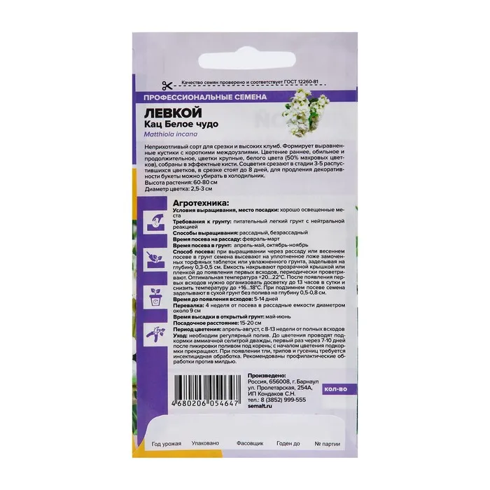 Необычайно красивый сорт, предназначенный, прежде всего, для получения роскошной срезки. Левкой Katz - это неповторимый аромат и длительное цветение. Серия отличается выравненностью по высоте и времени зацветания между различными окрасками, устойчивостью к жарким погодным условиям. Растение образует куст высотой 60-80 см. Крупные махровые цветки чистой белой окраски собраны в кистевидные соцветия и обладают тонким чарующим ароматом. Применяется для высадки в цветники, рабатки, вазоны и контейнеры, для посадки вдоль бордюров, используется при озеленении балконов и для срезки. Растение холодостойкое, предпочитает солнечное местоположение и легкие, нейтральные по кислотности, почвы, не любит застоя воды и длительной засухи.
