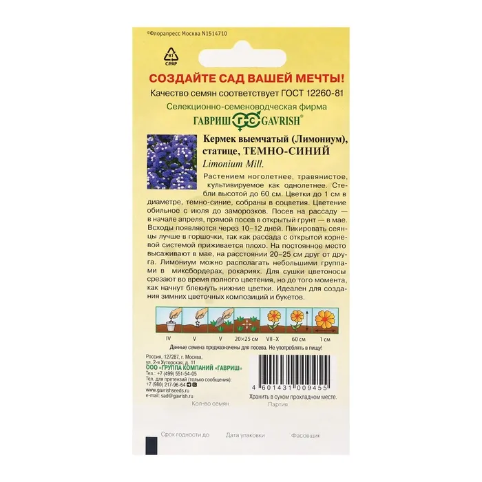 Растение многолетнее, травянистое, культивируемое как однолетнее. Стебли высотой до 60 см. Цветки мелкие, до 1 см в диаметре, темно-синие. Цветение обильное с июля до заморозков. Посев на рассаду в начале апреля, прямой посев в открытый грунт в мае. Всходы появляются через 10-12 дней. Пикировать сеянцы лучше в горшочки, так как рассада с открытой корневой системой приживается плохо. На постоянное место высаживают в мае, на расстоянии 20-25 см друг от друга. Лимониум можно располагать небольшими группами в миксбордерах, рокариях. Для сушки цветоносы срезают во время полного цветения, но до того момента, как начнут блекнуть нижние цветки.